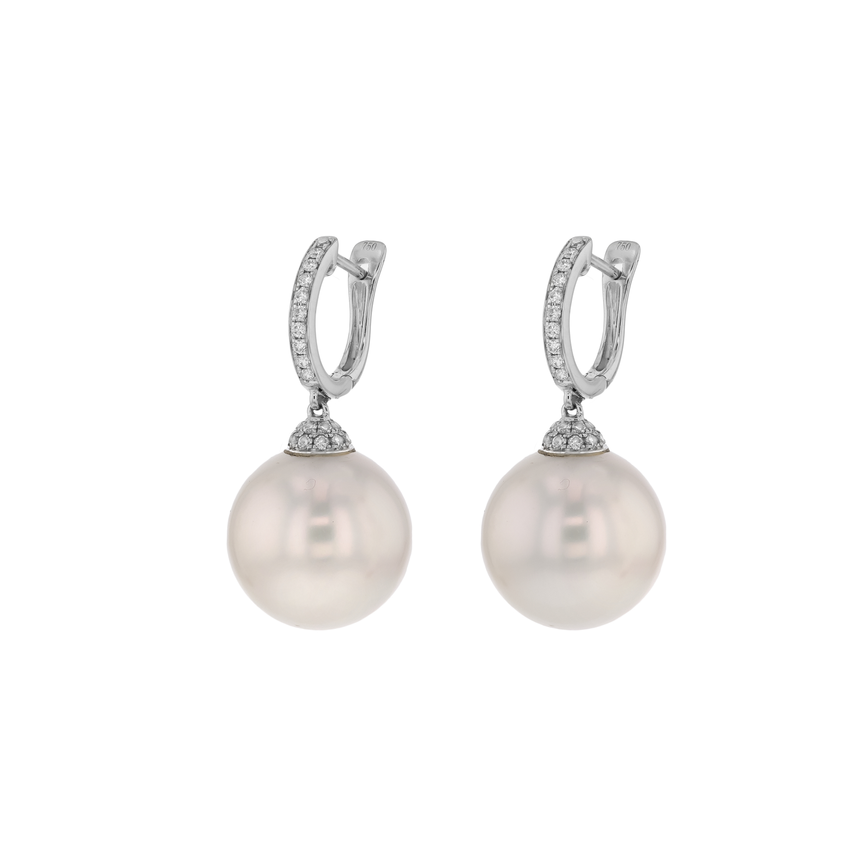 18K 13.5mm Round White South Sea Pearls on Diamond Huggies 54D=.34ct